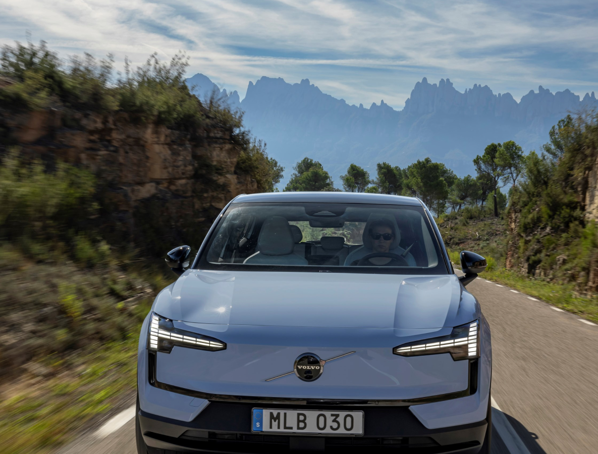 Front view of Volvo EX30 on a scenic road