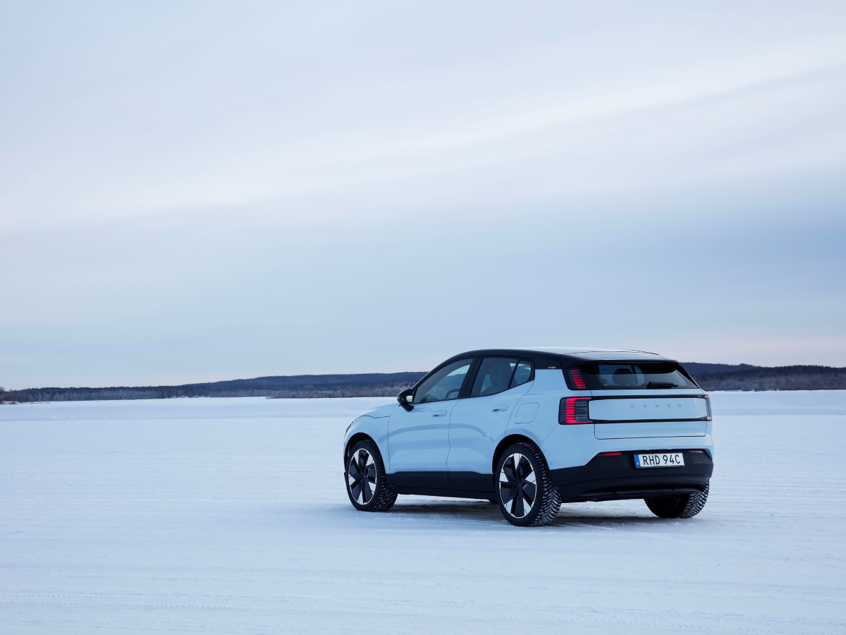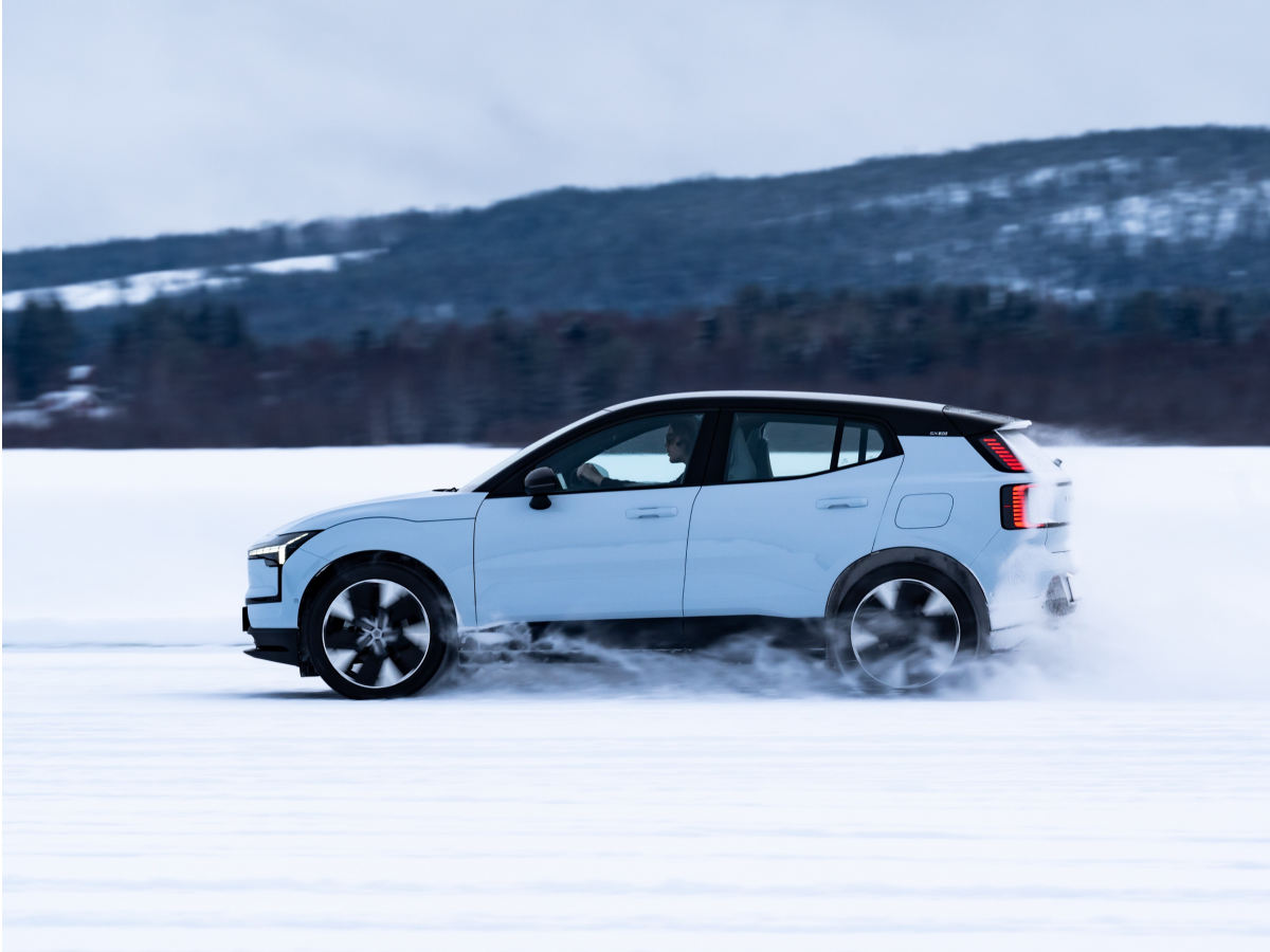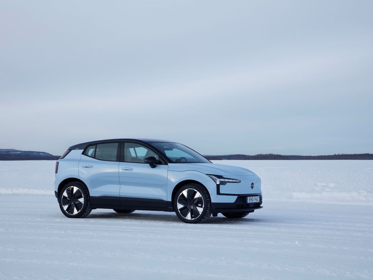 Side view of Volvo EX30 on icy terrain