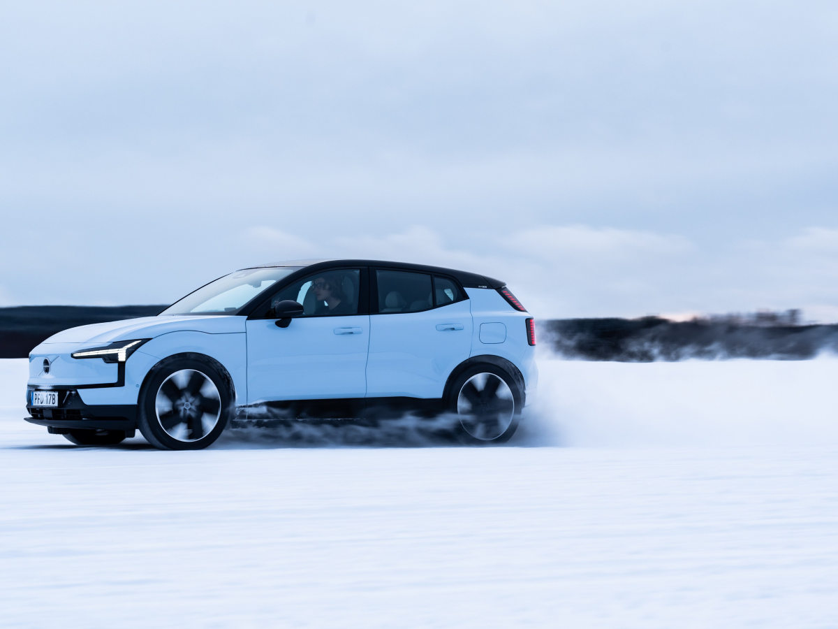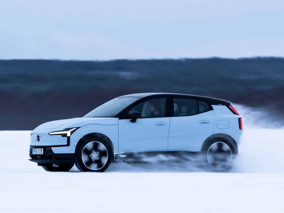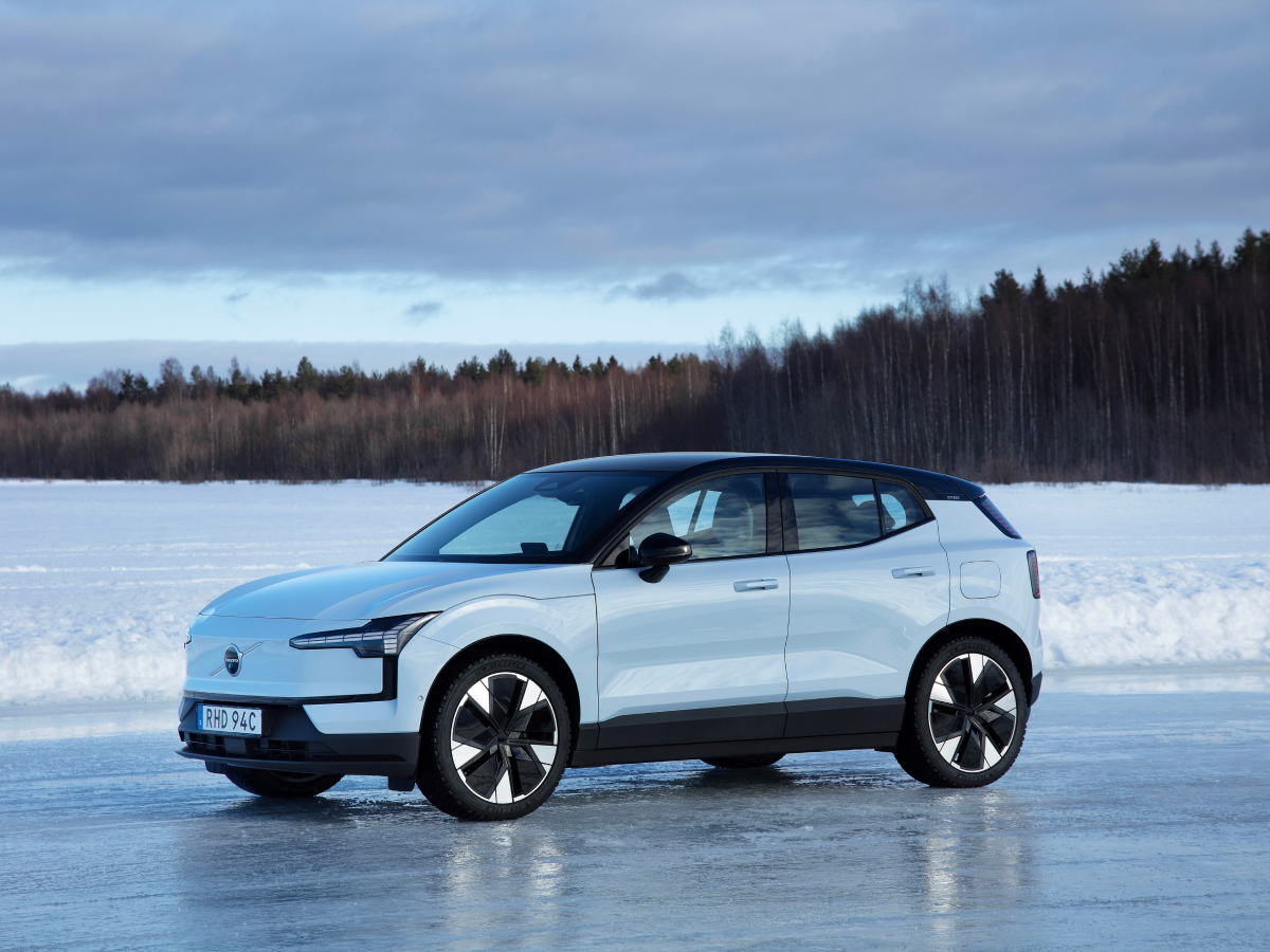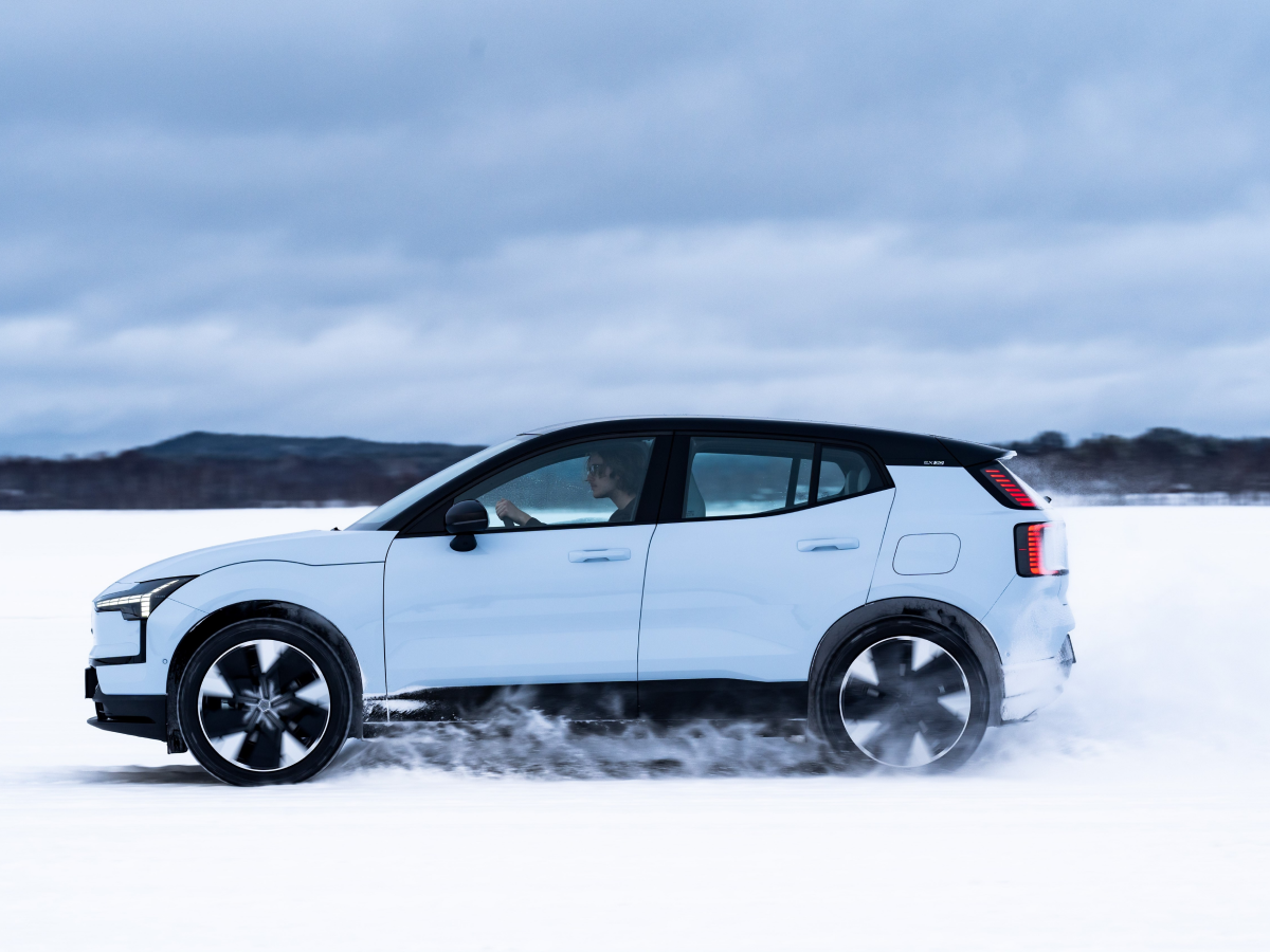 Side view of Volvo EX30 on icy terrain