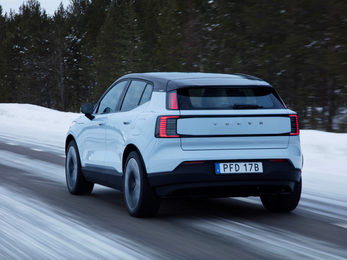 Rear angle of Volvo EX30 in motion on snowy road