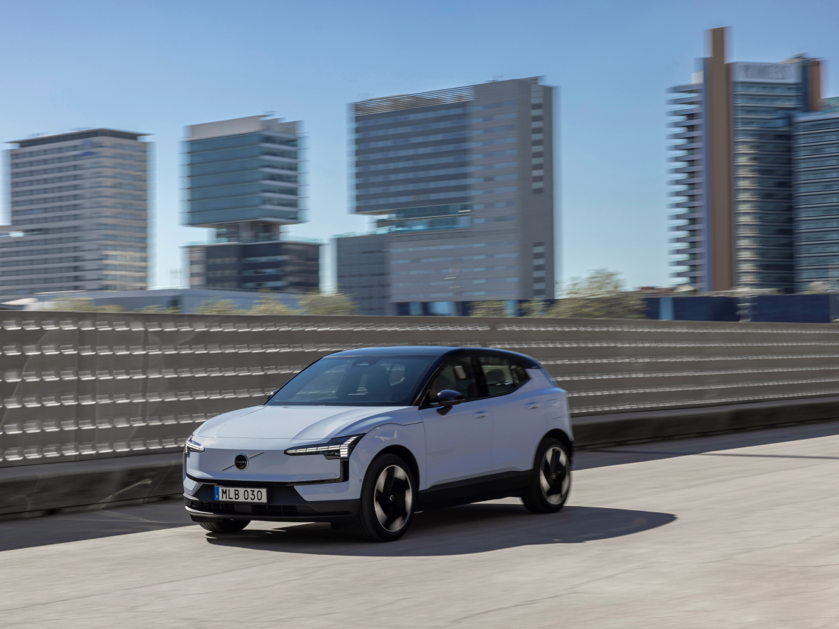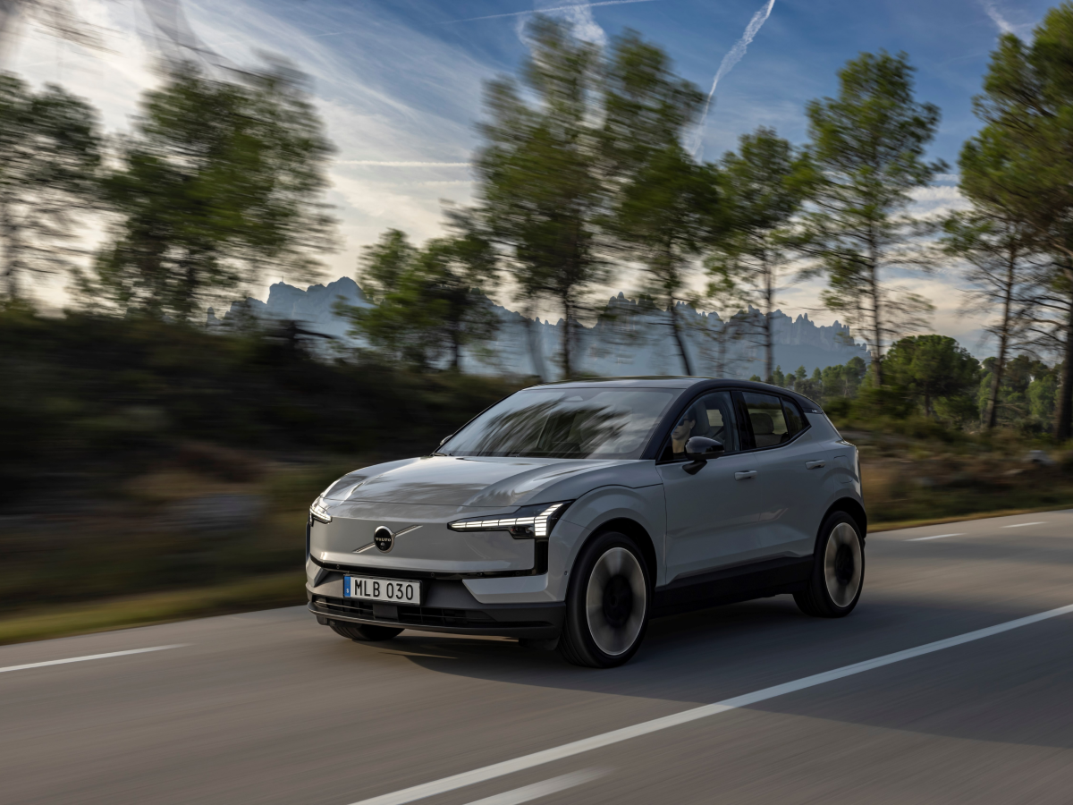 Side profile of Volvo EX30 in action